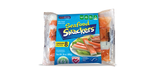 Seafood Snackers are an easy way to enjoy delicious, high quality surimi seafood as a quick and simple snack. Fully cooked and ready-to-eat, each 3 oz. package contains 4 crab-flavored surimi seafood sticks that can be enjoyed right out of the bag.